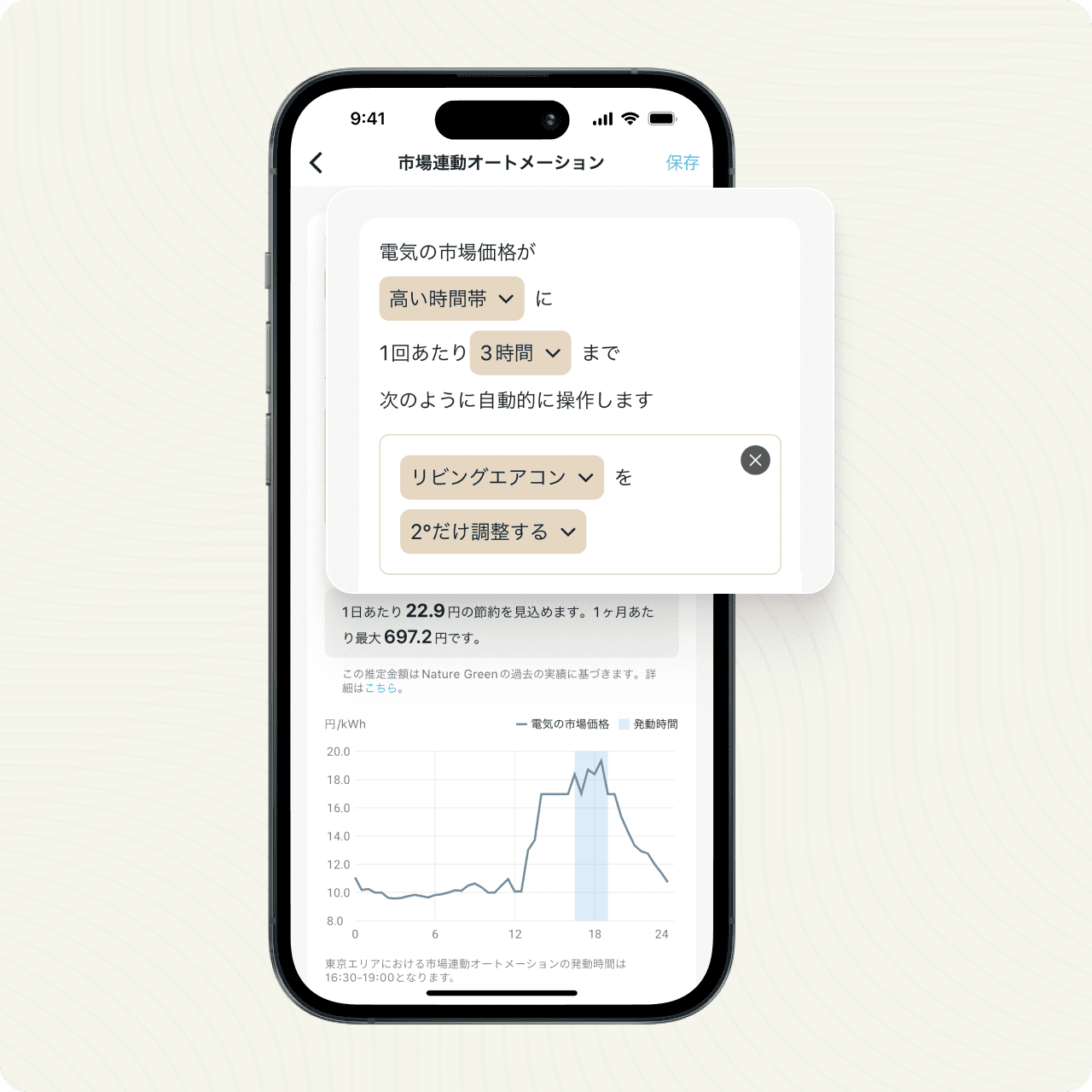 ※市場価格連動オートメーションで暖房温度を2℃調整した際の節電量は、弊社実績をもとに 0.18 kWh/時間 として試算。