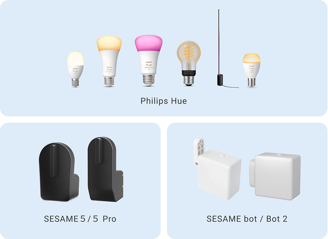 スマート照明「Philips Hue」、スマートロック製品「SESAME 5 (北米北欧版含む)/5Pro」、指ロボット「SESAME Bot 2」に対応しています。Nature Homeアプリからまとめて操作することが可能です。 ※2 ※3 ※4